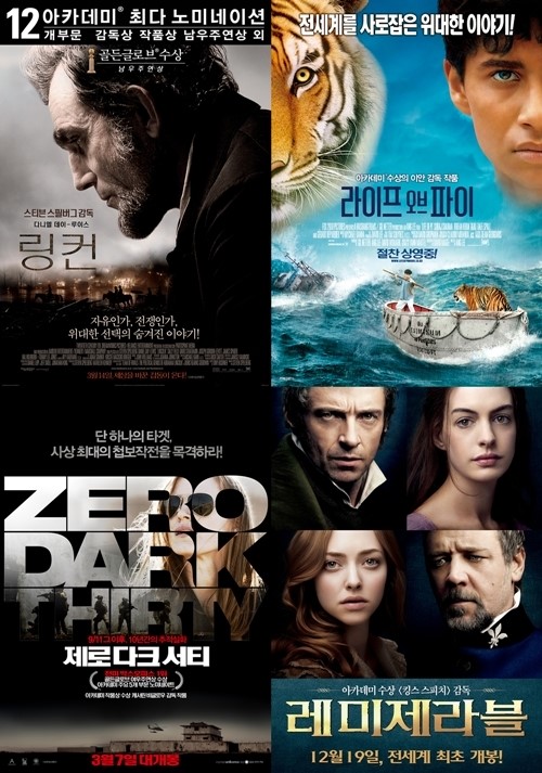 [영화 '링컨', '라이프 오브 파이', '레미제라블', '제로 다크 서티'(왼쪽 위부터 시계방향) 포스터. 사진 = 이십세기폭스코리아, UPI, 유니코리아 제공]